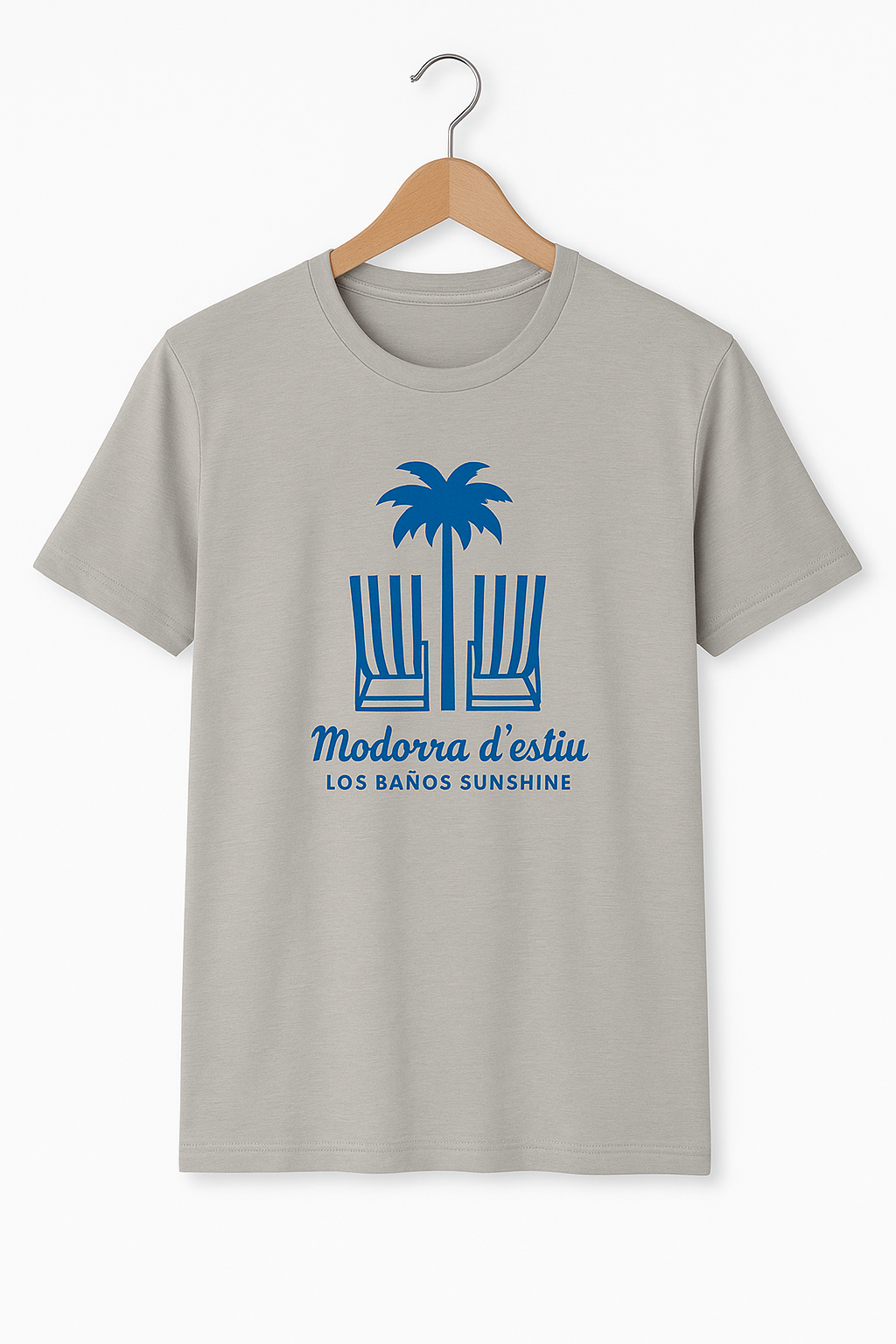 Relájate con estilo con la camiseta “Modorra d’estiu” de Los Baños Sunshine. Fabricada en algodón gris claro de alta calidad, esta prenda destaca por su ilustración en azul: dos hamacas bajo una palmera y la frase que resume el verano perfecto. Ideal para paseos al sol, tardes sin prisa o como recuerdo de los días más tranquilos junto al mar. Corte unisex, disponible en varias tallas.